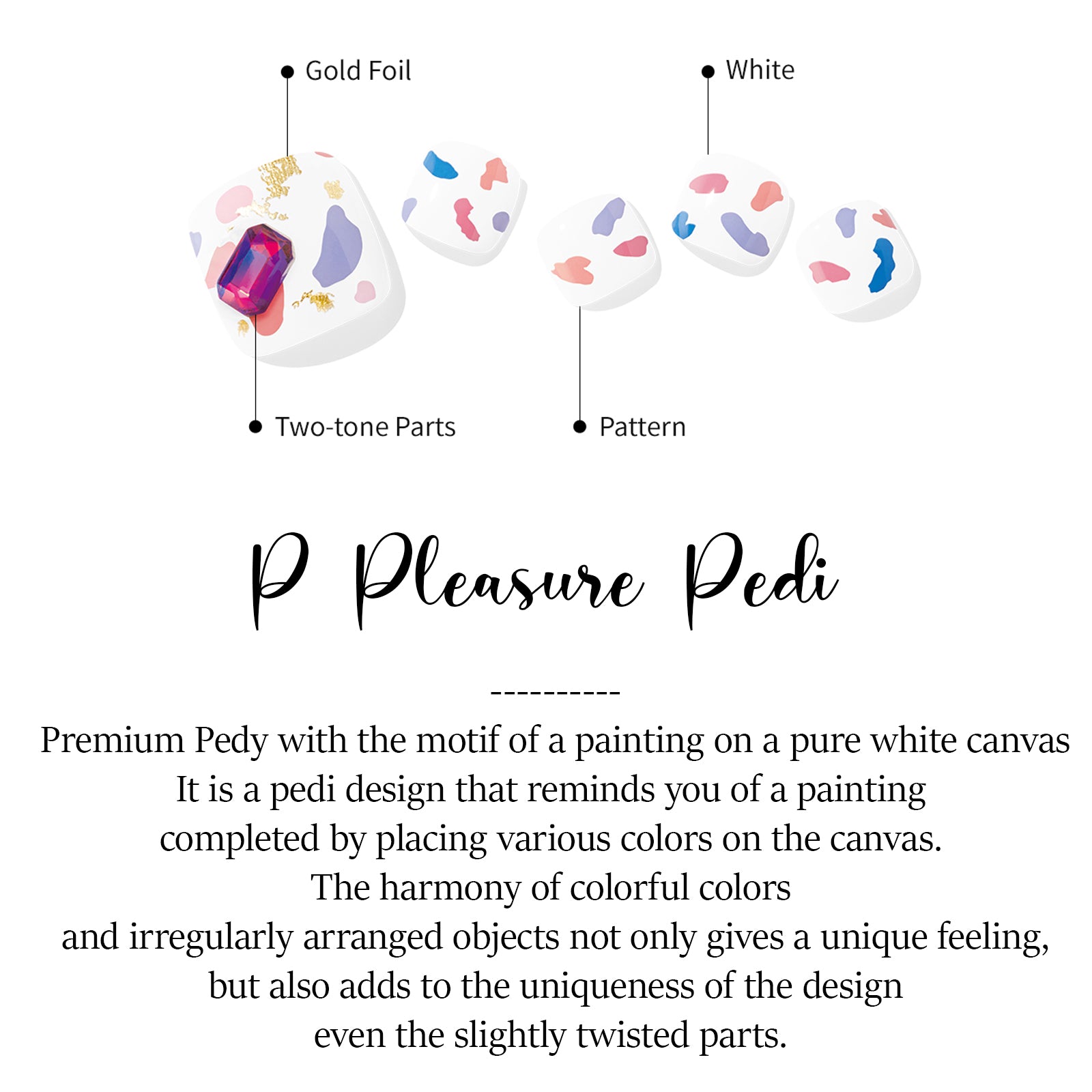 - Premium Pedy with the motif of a painting on a pure white canvas It is a pedi design that reminds you of a painting completed by placing various colors on the canvas. The harmony of colorful colors and irregularly arranged objects not only gives a unique feeling but also adds to the uniqueness of the design even the slightly twisted parts. by @lmg_nail